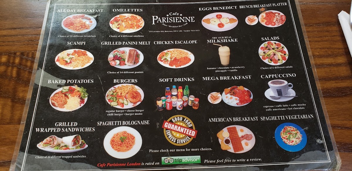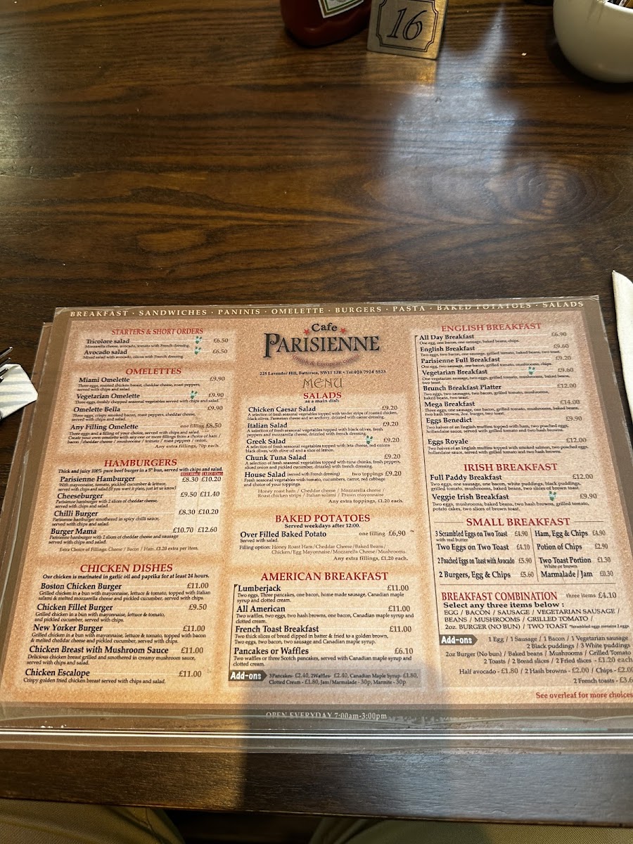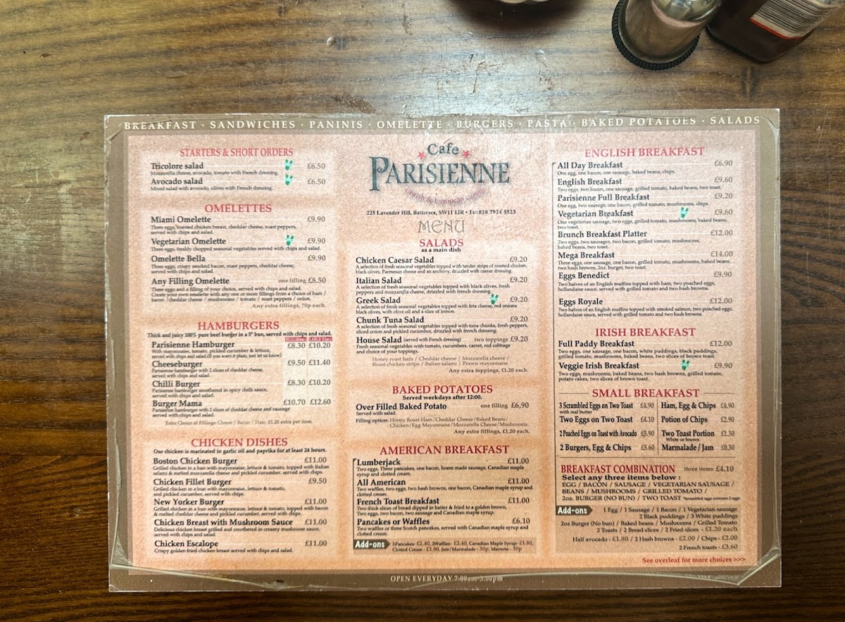 Welcome to Cafe Parisienne, a delightful café located at 225 Lavender Hill, London. This hidden gem offers a menu brimming with flavor, showcasing a range of expertly crafted dishes. The tantalizing Chicken Caesar Salad and the vibrant Greek Salad both priced at £9.20 stand out as fresh options for salad lovers. For breakfast enthusiasts, the Lumberjack and All American breakfasts, each £11.00, provide hearty starts to the day. Be sure to indulge in their special grilled wrapped sandwiches, with choices like Minty Lamb and Seafood Wrap, designed to satisfy a variety of palates. Customers rave about the exceptional quality and friendly service at Cafe Parisienne, making it an inviting spot for both locals and visitors. Whether you’re after a quick bite or a leisurely meal, the inviting atmosphere and flavorful menu ensure a memorable dining experience.